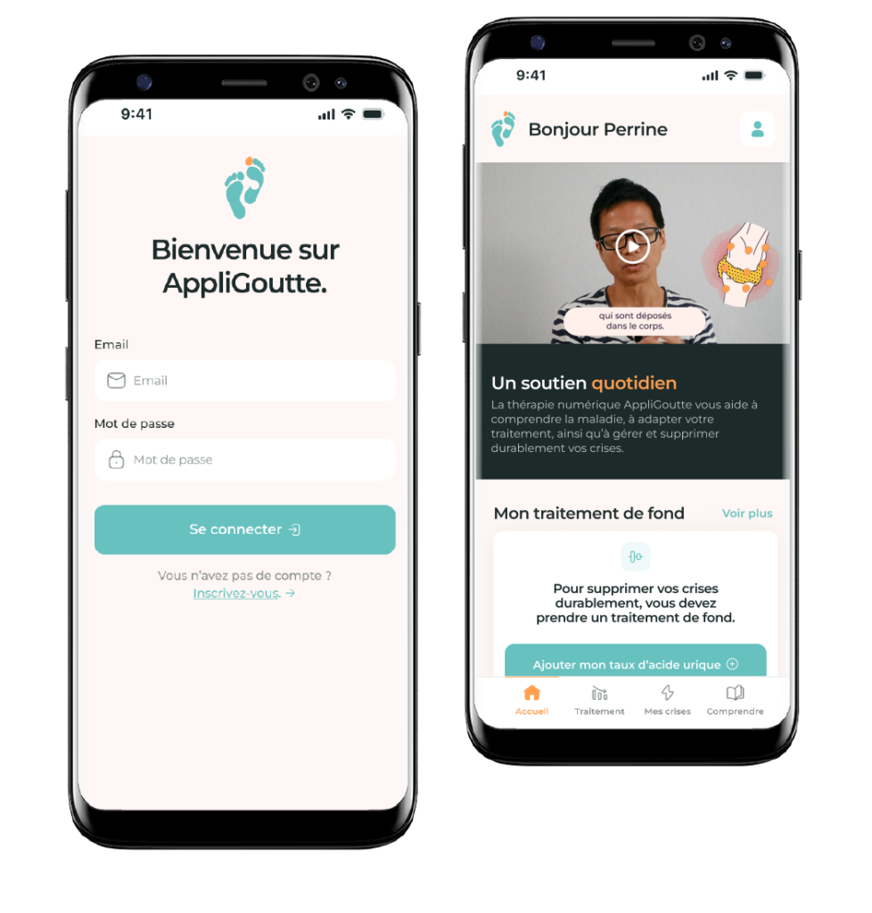 AppliGoutte est une thérapie digitale sous forme d’application mobile pour les personnes vivant avec la goutte. Elle apporte toutes les connaissances et les outils d’auto-suivi nécessaires pour supprimer durablement les crises de goutte, en complément des consultations chez le médecin. Elle est en français.